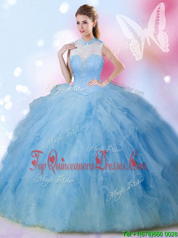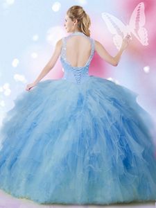 Dazzling Baby Blue Lace Up High-neck Beading and Ruffles Quinceanera Dress Tulle Sleeveless