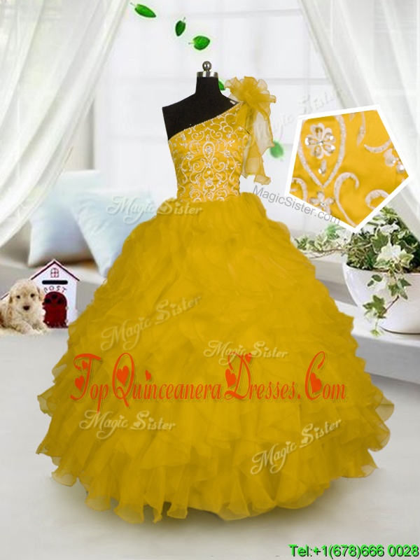 Dazzling Floor Length Gold Pageant Dress One Shoulder Sleeveless Side Zipper