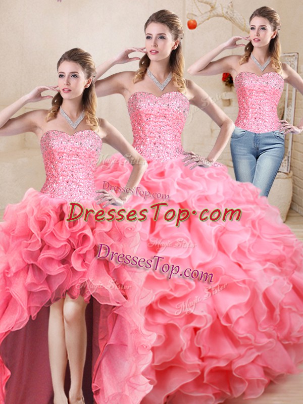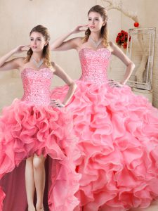 Dazzling Floor Length Three Pieces Sleeveless Watermelon Red Quinceanera Gown Lace Up