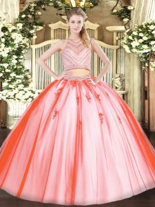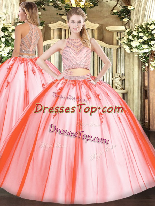 Dazzling Floor Length Watermelon Red Ball Gown Prom Dress Tulle Sleeveless Beading