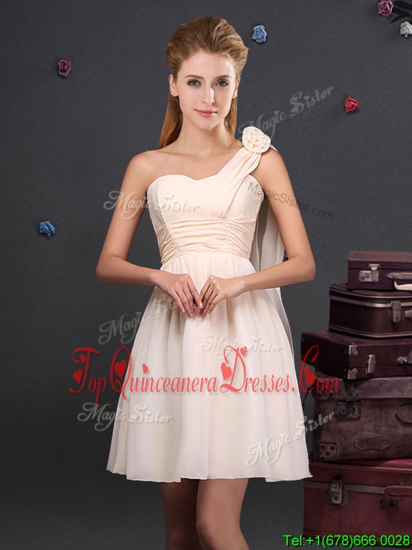 Dazzling One Shoulder Sleeveless Chiffon Quinceanera Court of Honor Dress Ruching and Hand Made Flower Zipper