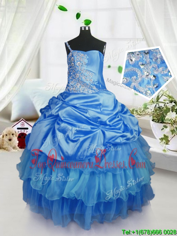 Dazzling Organza Strapless Sleeveless Lace Up Beading and Ruffled Layers and Pick Ups Little Girls Pageant Dress in Baby Blue