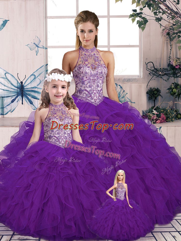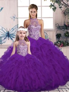 Dazzling Purple Sweet 16 Dress Military Ball and Sweet 16 and Quinceanera with Beading and Ruffles Halter Top Sleeveless Lace Up