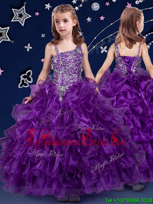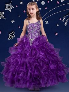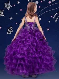 Dazzling Ruffled Ball Gowns Pageant Dress for Girls Purple Asymmetric Organza Sleeveless Floor Length Lace Up