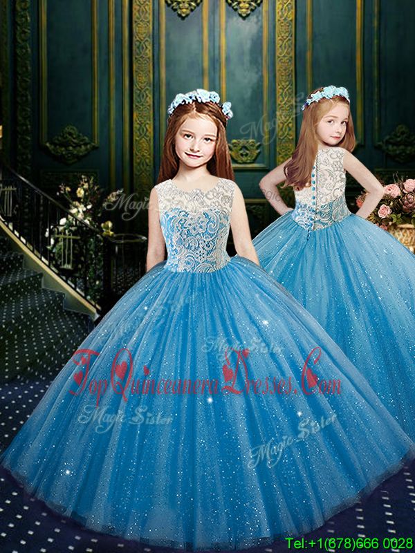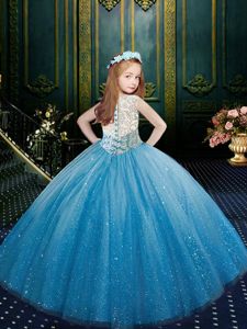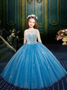 Dazzling Scoop Clasp Handle Blue Sleeveless Appliques Floor Length Custom Made Pageant Dress