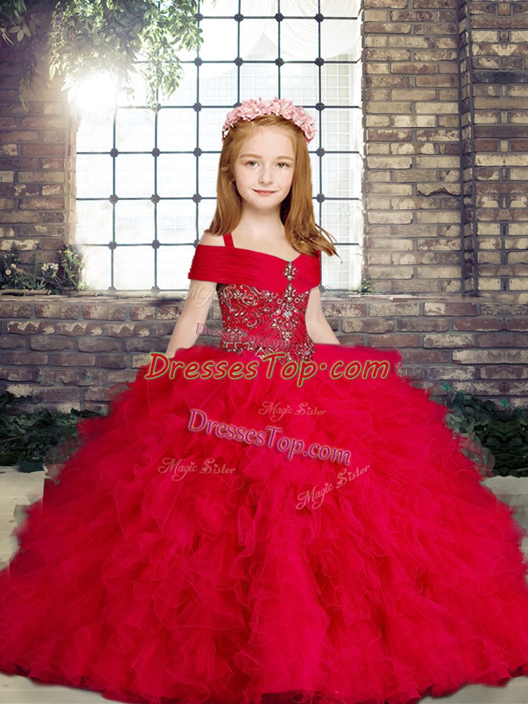Dazzling Sleeveless Floor Length Beading and Ruffles Lace Up Little Girl Pageant Dress with Red