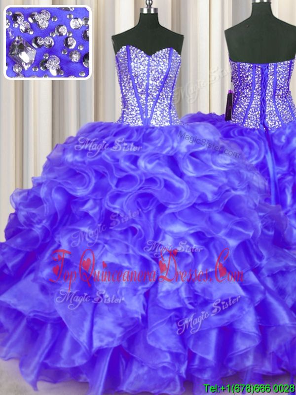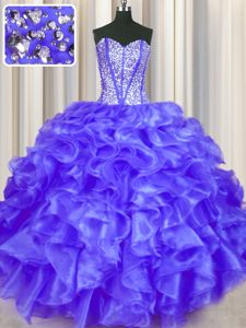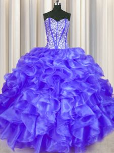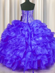 Dazzling Sleeveless Organza Floor Length Lace Up 15 Quinceanera Dress in Purple for with Beading and Ruffles