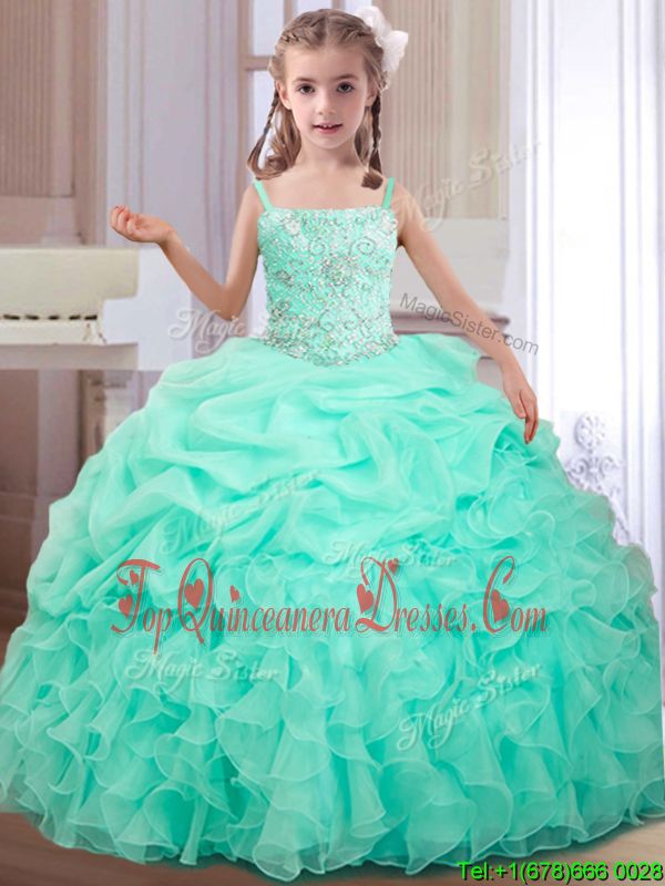 Dazzling Straps Sleeveless Little Girl Pageant Dress Floor Length Beading and Ruffles and Pick Ups Apple Green Organza