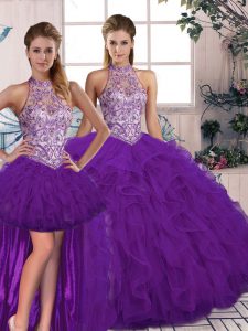Decent Floor Length Purple Vestidos de Quinceanera Halter Top Sleeveless Lace Up