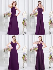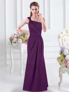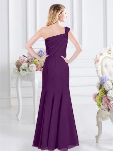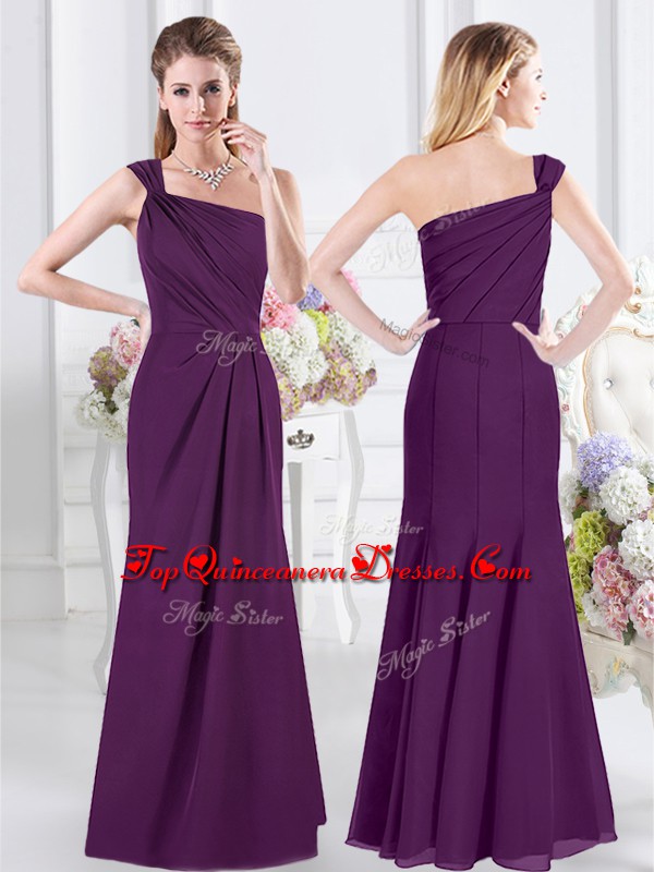 Decent One Shoulder Sleeveless Chiffon Floor Length Side Zipper Dama Dress for Quinceanera in Purple for with Ruching