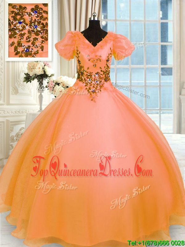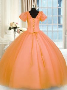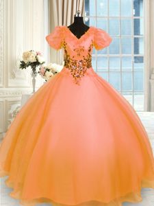 Decent Orange Ball Gowns Appliques Ball Gown Prom Dress Lace Up Organza Short Sleeves Floor Length