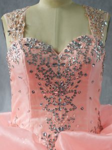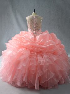 Decent Peach Organza Zipper Straps Sleeveless Floor Length 15th Birthday Dress Beading and Ruffles and Pick Ups