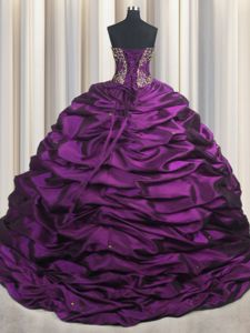 Decent Purple Taffeta Lace Up Ball Gown Prom Dress Sleeveless With Brush Train Beading and Appliques and Pick Ups