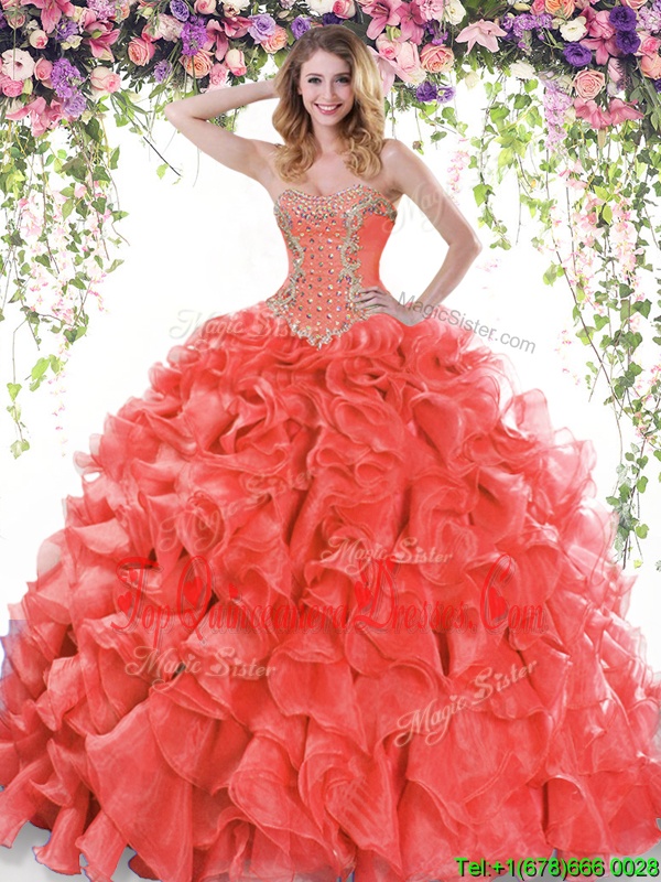 Decent Red Sleeveless Organza Sweep Train Lace Up Sweet 16 Dresses for Military Ball and Sweet 16 and Quinceanera