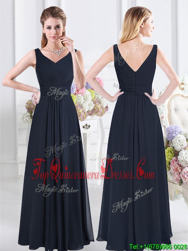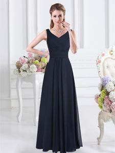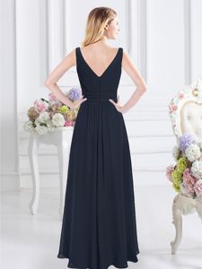 Decent V-neck Sleeveless Dama Dress Floor Length Ruching Navy Blue Chiffon