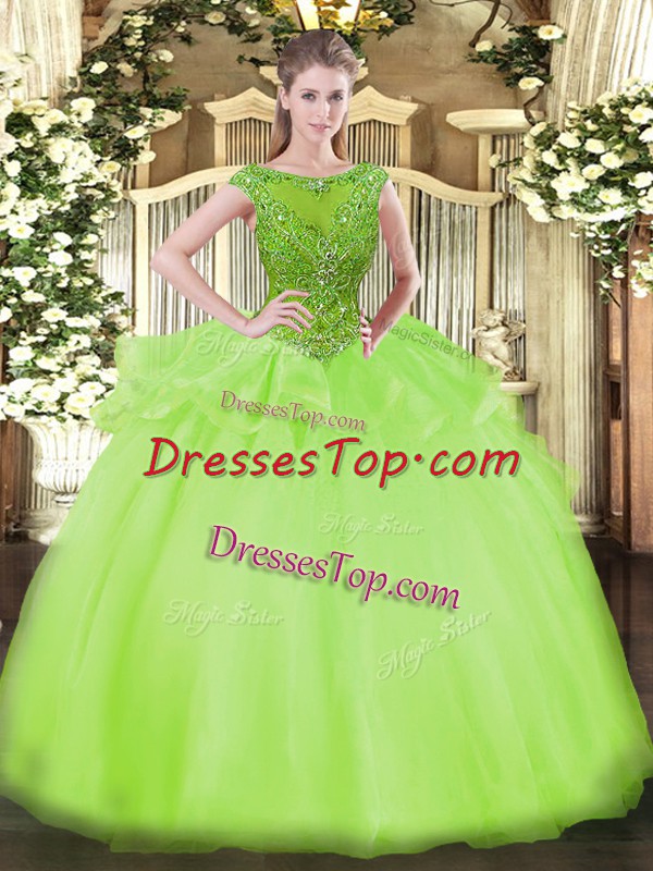 Delicate Beading Quince Ball Gowns Yellow Green Zipper Cap Sleeves Floor Length