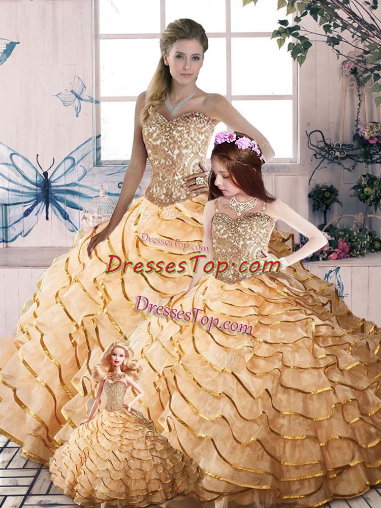 Delicate Champagne Lace Up Vestidos de Quinceanera Beading and Ruffled Layers Sleeveless Brush Train