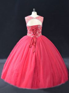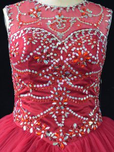 Delicate Coral Red Tulle Lace Up Scoop Long Sleeves Floor Length Quinceanera Gowns Beading