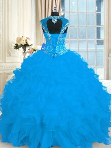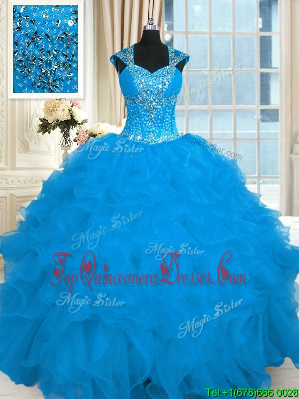 Delicate Floor Length Ball Gowns Cap Sleeves Aqua Blue Sweet 16 Dress Lace Up