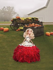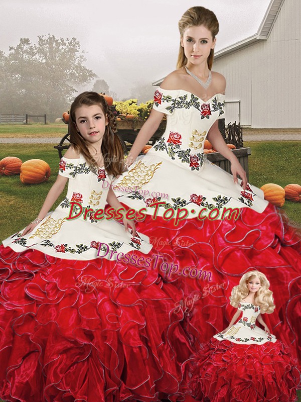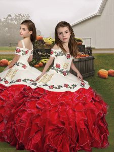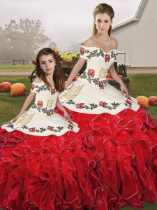 Delicate Floor Length Lace Up Ball Gown Prom Dress White And Red for Military Ball and Sweet 16 and Quinceanera with Embroidery and Ruffles