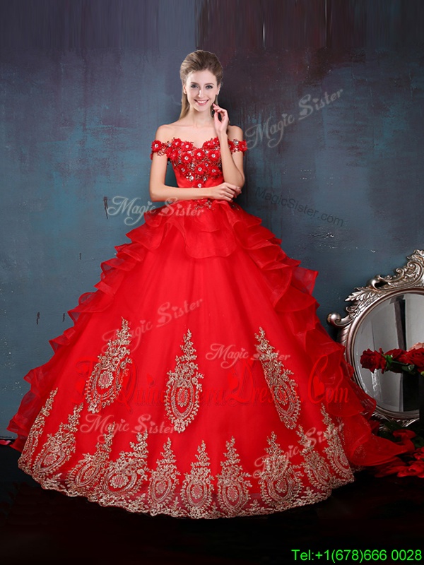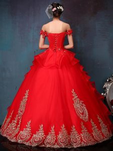 Delicate Red Off The Shoulder Neckline Beading and Appliques and Ruffles Sweet 16 Quinceanera Dress Sleeveless Lace Up