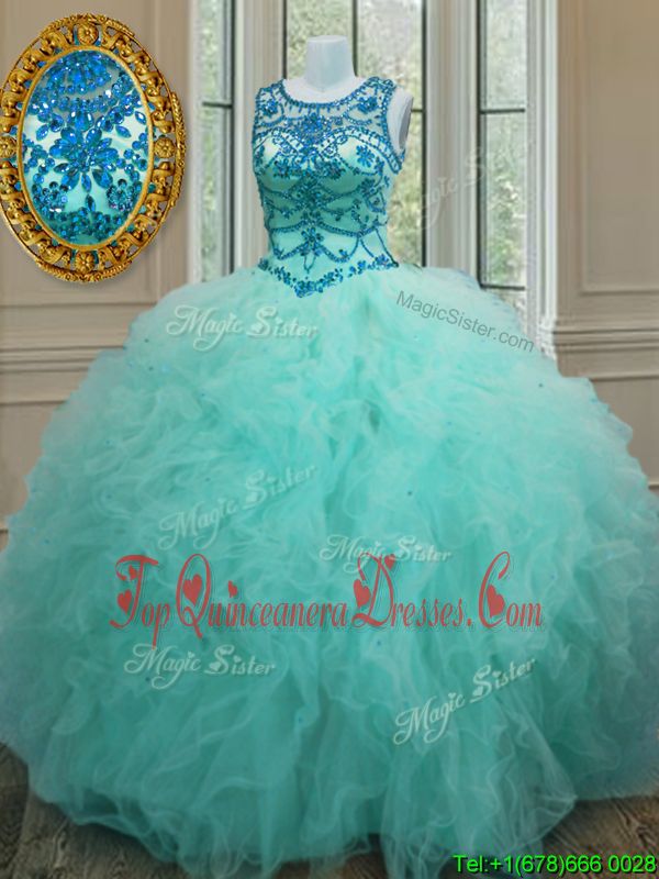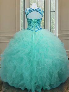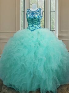 Delicate Scoop Sleeveless Ball Gown Prom Dress Floor Length Beading and Ruffles Turquoise Tulle