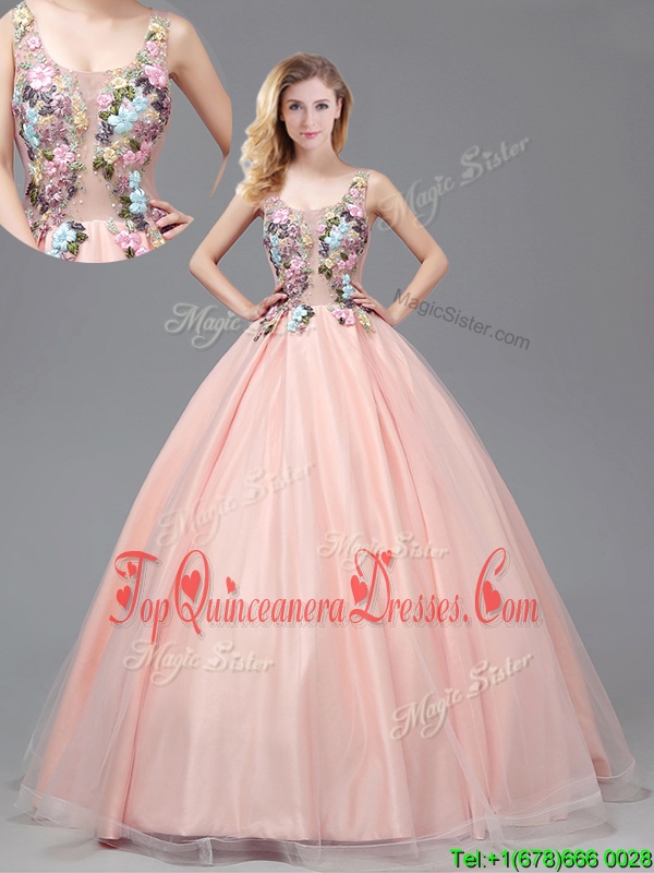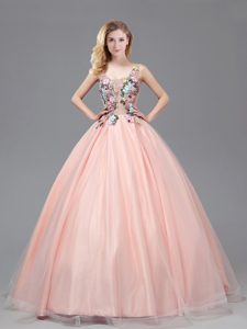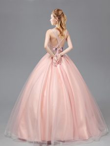 Delicate See Through A-line Quinceanera Gowns Baby Pink Straps Tulle Sleeveless Floor Length Criss Cross