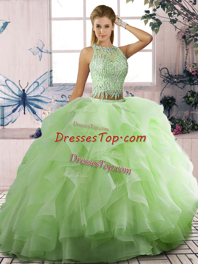Delicate Two Pieces Quinceanera Gowns Yellow Green Scoop Tulle Sleeveless Floor Length Lace Up