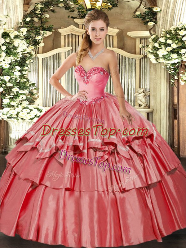 Deluxe Coral Red Ball Gowns Organza and Taffeta Sweetheart Sleeveless Beading and Ruffled Layers Floor Length Lace Up Sweet 16 Dresses