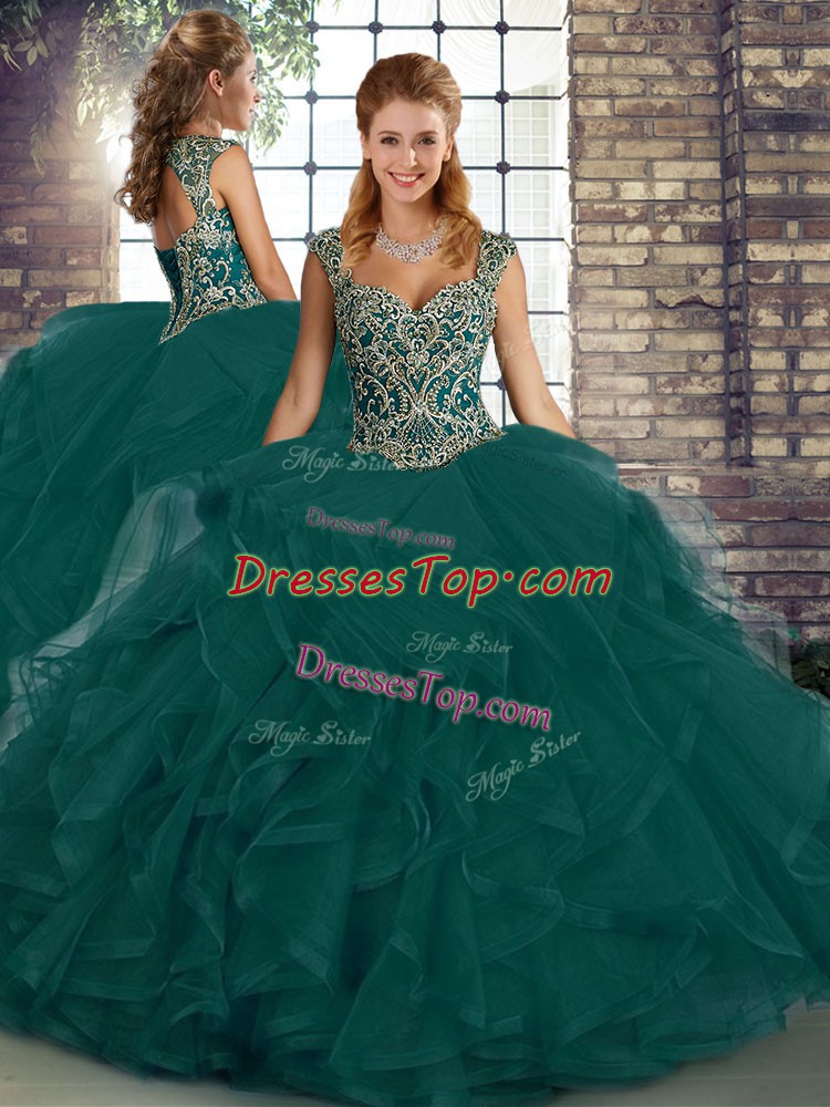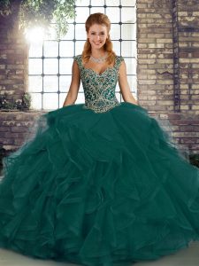 Deluxe Floor Length Ball Gowns Sleeveless Peacock Green Vestidos de Quinceanera Lace Up