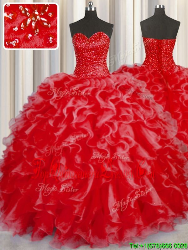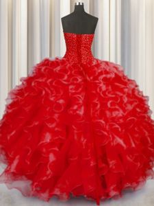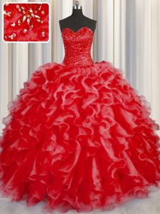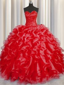 Deluxe Floor Length Coral Red Quince Ball Gowns Halter Top Sleeveless Lace Up