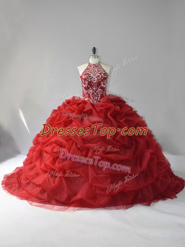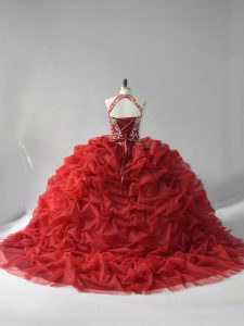 Deluxe Halter Top Sleeveless Court Train Lace Up Quince Ball Gowns Wine Red Organza