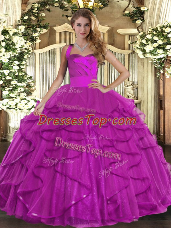 Deluxe Mermaid Sweet 16 Quinceanera Dress Fuchsia Halter Top Tulle Sleeveless Floor Length Lace Up