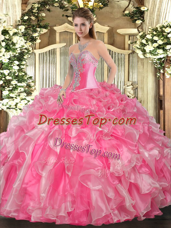 Deluxe Rose Pink Sleeveless Beading and Ruffles Floor Length Vestidos de Quinceanera