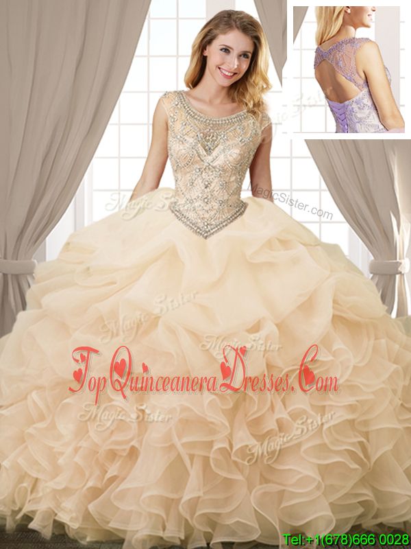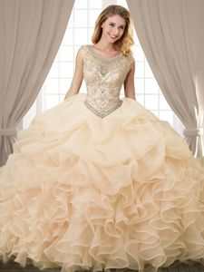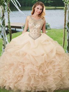Deluxe Scoop Sleeveless Organza Floor Length Lace Up Sweet 16 Dresses in Champagne for with Beading and Ruffles and Pick Ups