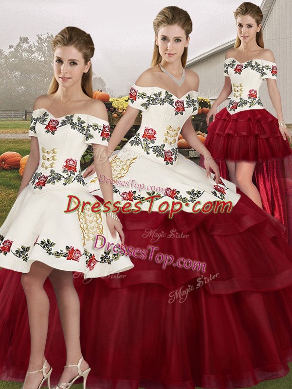 Deluxe Sleeveless Tulle Brush Train Lace Up Sweet 16 Quinceanera Dress in Wine Red with Embroidery and Ruffled Layers