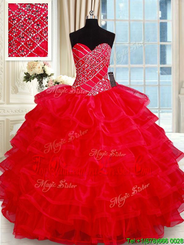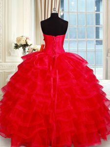 Deluxe Sleeveless Tulle Floor Length Lace Up Sweet 16 Quinceanera Dress in Red for with Beading and Ruffled Layers