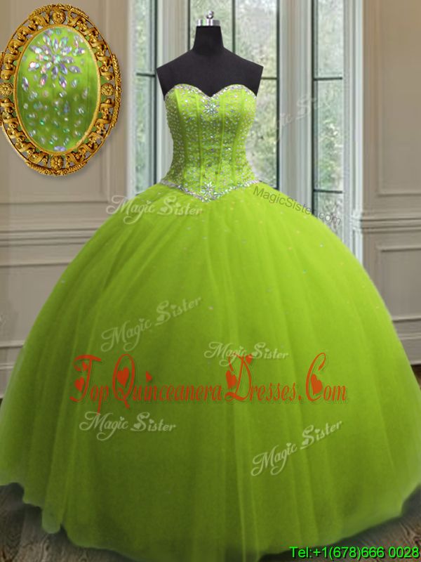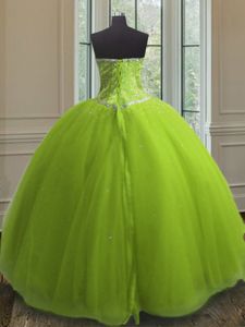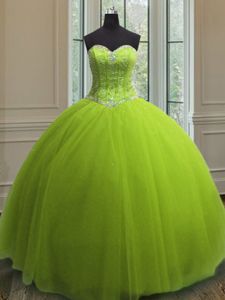 Deluxe Yellow Green Sleeveless Floor Length Beading and Sequins Lace Up Quince Ball Gowns