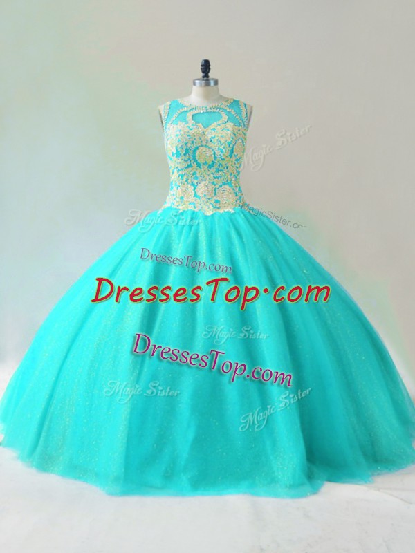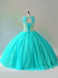 Designer Aqua Blue Ball Gowns Scoop Sleeveless Tulle Floor Length Lace Up Beading Sweet 16 Dress