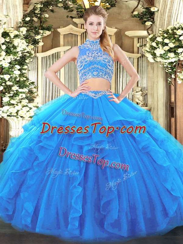 Designer Baby Blue Sleeveless Beading and Ruffles Floor Length Quinceanera Gown