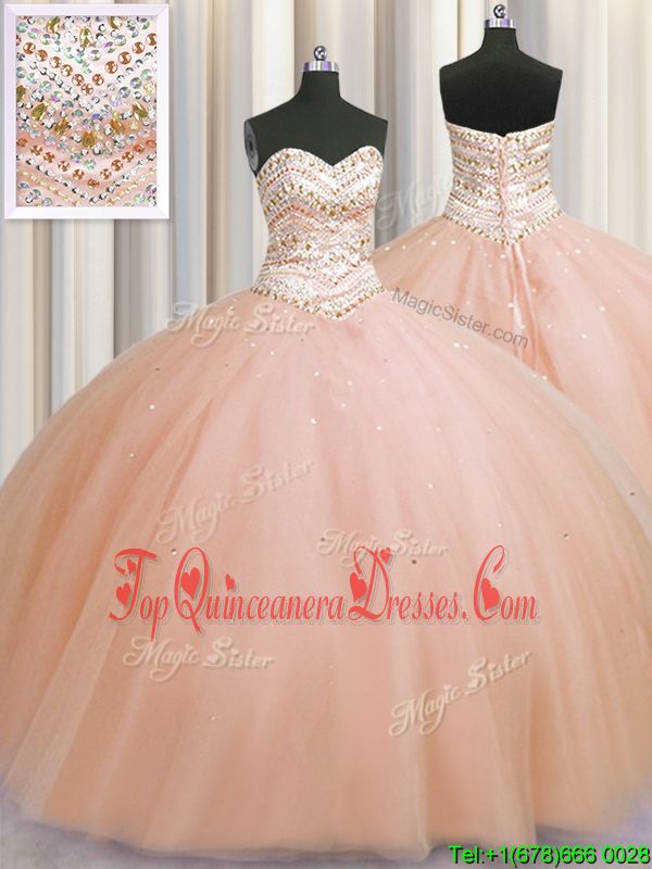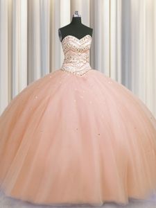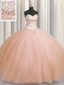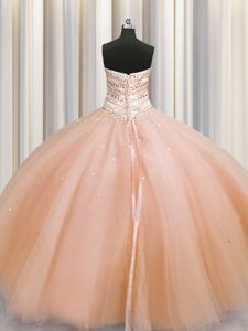 Designer Bling-bling Really Puffy Peach Tulle Lace Up Sweetheart Sleeveless Floor Length Sweet 16 Dresses Beading