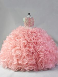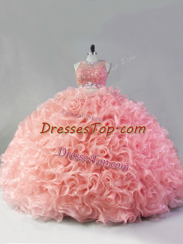 Designer Fabric With Rolling Flowers Sleeveless Floor Length Quinceanera Dress and Beading and Ruffles