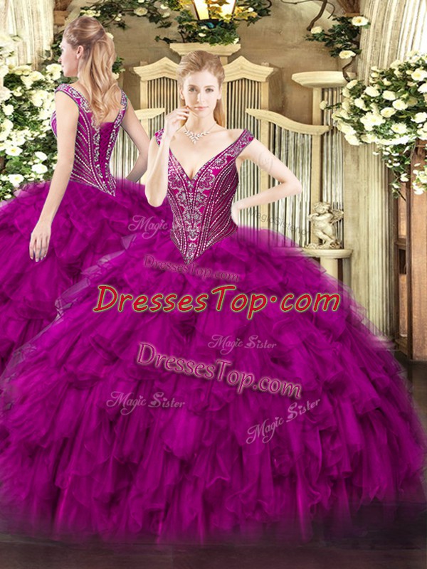 Designer Fuchsia Lace Up 15 Quinceanera Dress Beading and Ruffles Sleeveless Floor Length