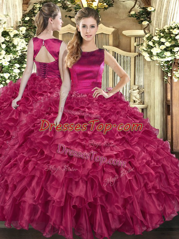 Designer Fuchsia Organza Lace Up Bateau Sleeveless Floor Length Ball Gown Prom Dress Ruffles