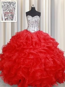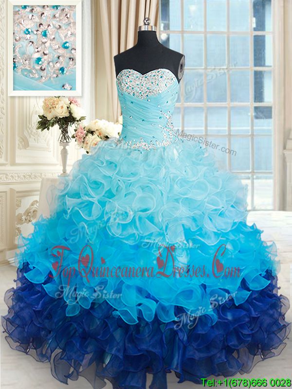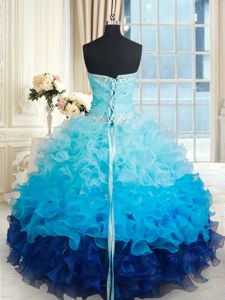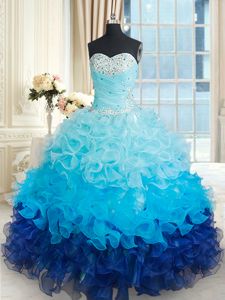 Designer Sleeveless Organza Floor Length Lace Up Ball Gown Prom Dress in Blue And White for with Ruffles and Sequins