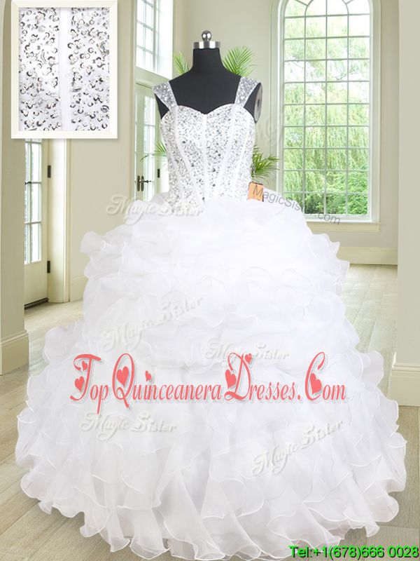 Designer Straps Straps Sleeveless Organza Floor Length Lace Up Quinceanera Dresses in White for with Beading and Ruffles