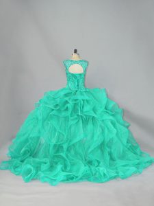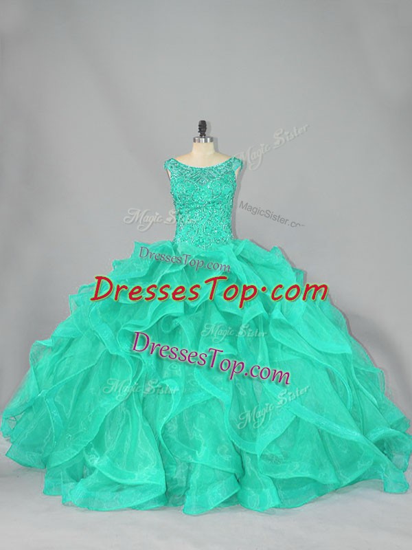Discount Beading and Ruffles Ball Gown Prom Dress Turquoise Lace Up Sleeveless Floor Length