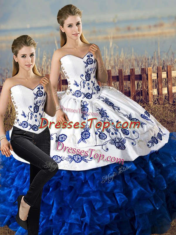 Discount Blue And White Sleeveless Floor Length Embroidery and Ruffles Lace Up 15 Quinceanera Dress
