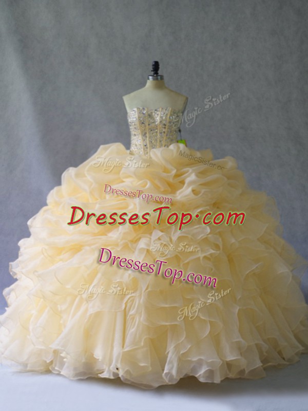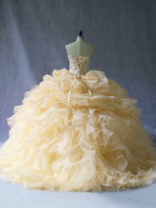 Discount Gold Organza Lace Up Quinceanera Gown Sleeveless Floor Length Beading and Ruffles and Pick Ups