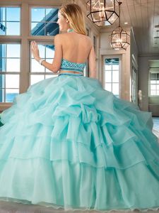 Discount Halter Top Pick Ups Ruffled Aqua Blue Sleeveless Organza Brush Train Backless Ball Gown Prom Dress for Military Ball and Sweet 16 and Quinceanera